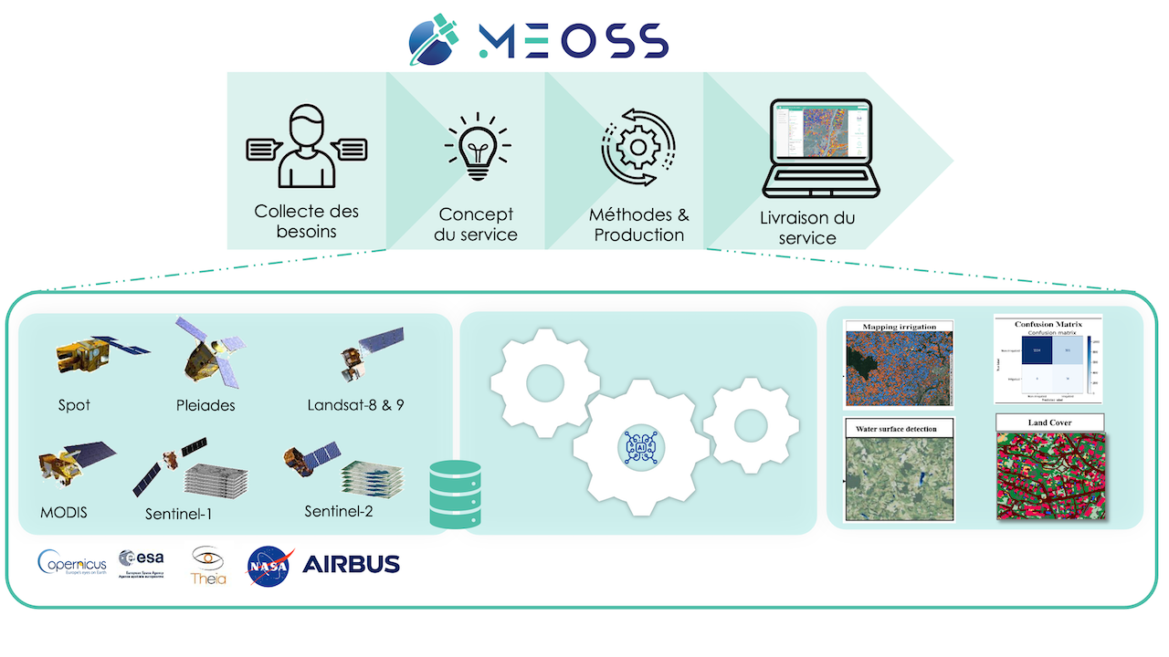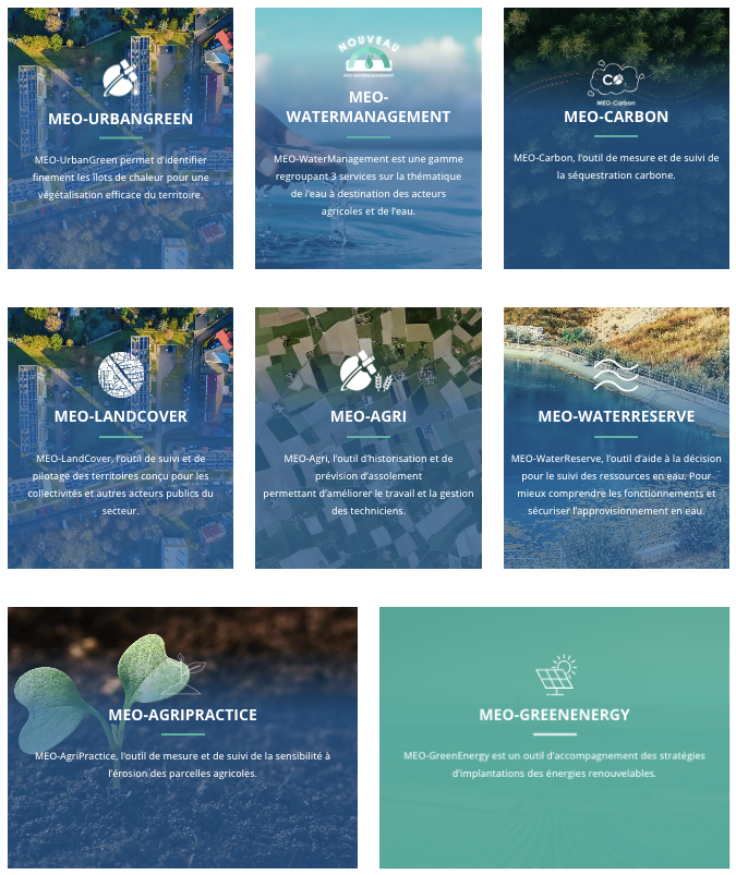 Aujourd’hui MEOSS dispose d’un ensemble de services et produits prêts à être déployés sur des territoires de tailles différentes et pour des clients de divers horizons. Les thématiques traitées concernent principalement l’estimation des stocks et des flux de carbone, le suivi des surfaces en eau et l’estimation des volumes stockés, la détection des culture irriguées, le potentiel en énergie d’origine photovoltaïque, îlots de chaleur et verdissement des centre-bourgs. Pour ce faire MEOSS, a mis au point des algorithmes d’Intelligence Artificielle basés sur les dernières avancées technologiques (Machine Learning et Deep Learning) ainsi que sur le recours quasi-systématique aux données d’observation de la Terre issues des capteurs satellites et/ou aériens, le tout combiné aux données locales des territoires d’application.