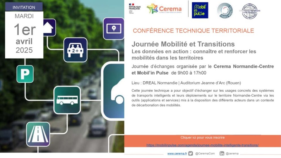 Journée Journée Mobilité Intelligente & Transitions organisée à Rouen par Mobil'inPulse et le Cerema le 1er avril de 9h00 à 17h00.